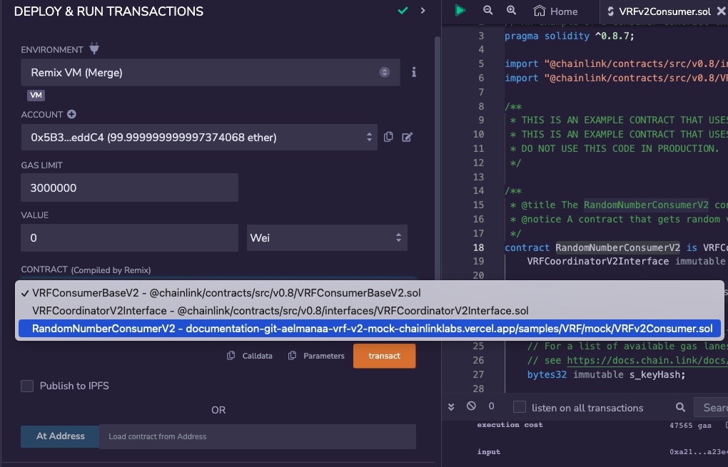 2. Under DEPLOY & RUN TRANSACTIONS, select RandomNumberConsumerV2.